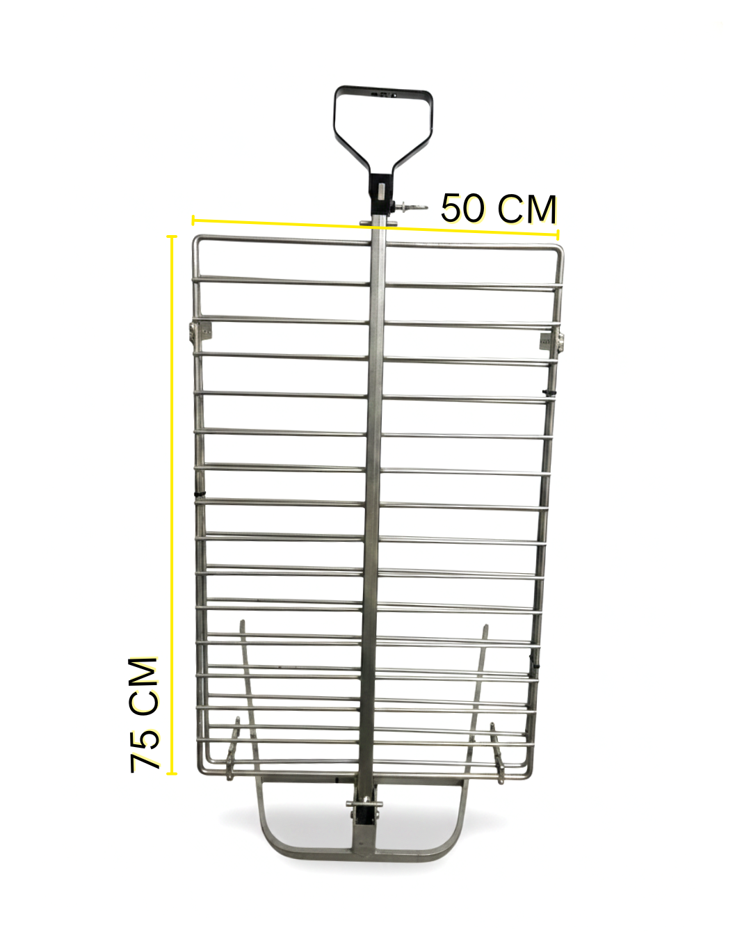 Asador de acero resistente con diseño vertical, ideal para asados parejos y seguros. Cuenta con manija superior y estructura firme. Disponible en medidas 60 x 90, 50 x 75 y 30 x 47.