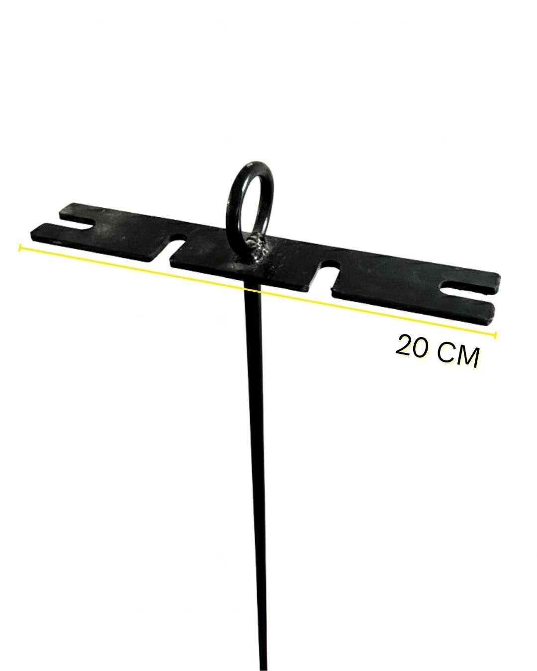 Cuenta con una barra superior metálica de 20 cm, provista de ranuras especialmente diseñadas para colgar accesorios como palita, atizador, pinza u otros utensilios de asador. En la parte superior incorpora un aro central que amplía las opciones de colgado y aporta estabilidad al conjunto.