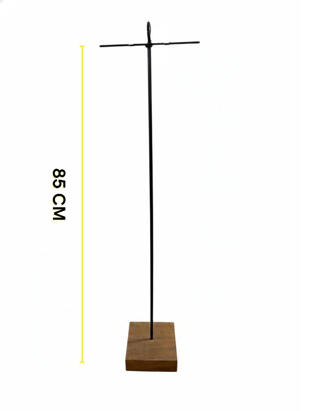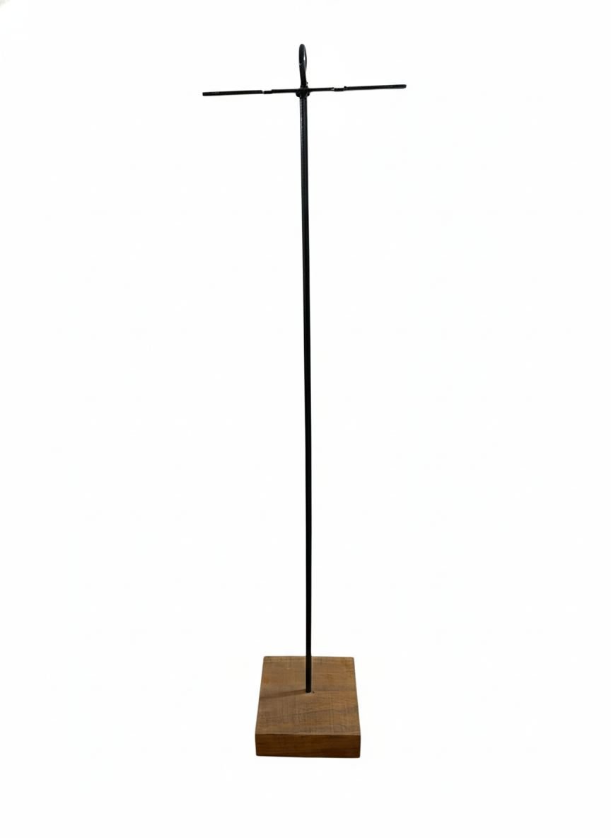 Base para accesorios de asador de diseño simple y funcional. Fabricada en estructura metálica con base de madera maciza, cuenta con 85 cm de altura y barra superior de 20 cm con ranuras para colgar palita, atizador y otros utensilios. Ideal para mantener el área del asado organizada y práctica.