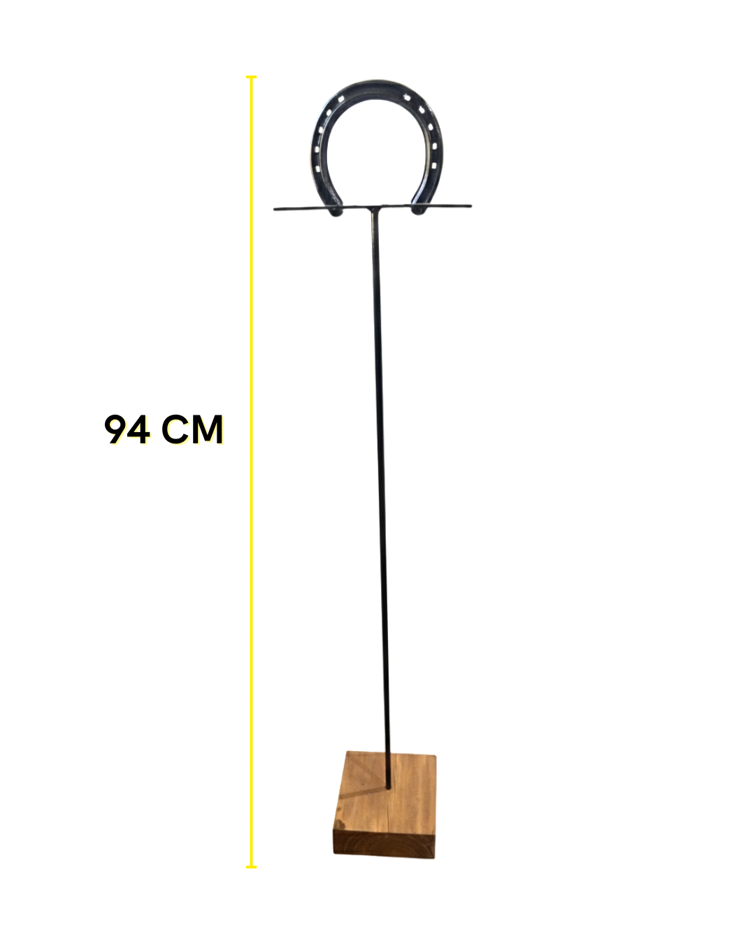 Base para accesorios de asador elaborada con una combinación de materiales resistentes y de estilo rústico. Cuenta con una base de madera sólida que brinda estabilidad, una varilla de hierro duradera y una herradura decorativa en la cima que aporta un toque tradicional y artesanal.