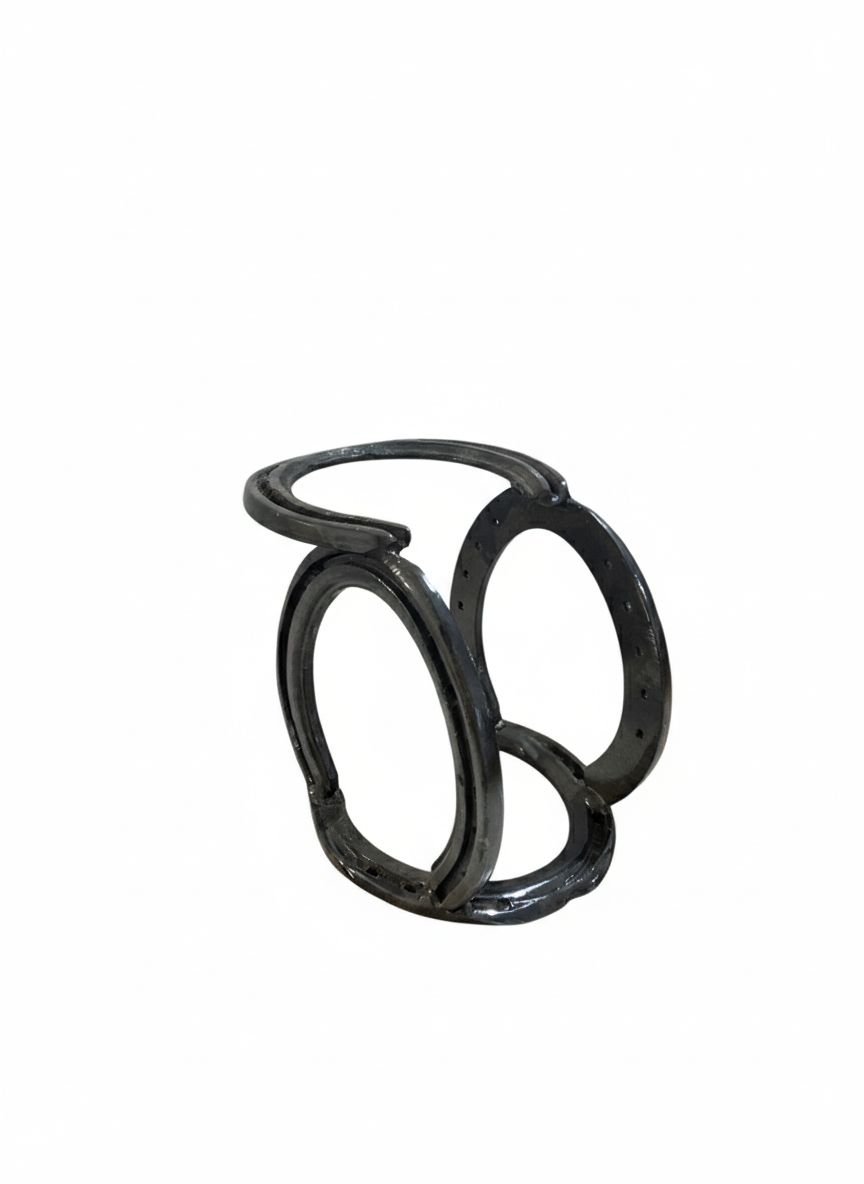 Este soporte con vino artesanal se destaca por su diseño simple pero original, realizado a partir de herraduras de metal cuidadosamente ensambladas. Su estética rústica con impronta artística lo convierte no solo en un objeto funcional, sino también en una pieza decorativa que aporta personalidad y carácter a cualquier ambiente.