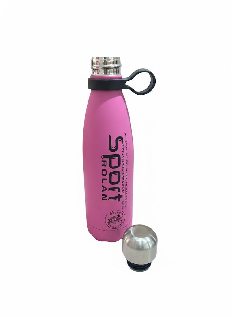 Botella térmica deportiva color rosa con interior de acero inoxidable, diseñada para mantener la temperatura de tus bebidas por más tiempo. Cuenta con tapa a rosca y aro de sujeción para un transporte cómodo y seguro. Resistente, reutilizable y perfecta para el uso diario o actividades deportivas.