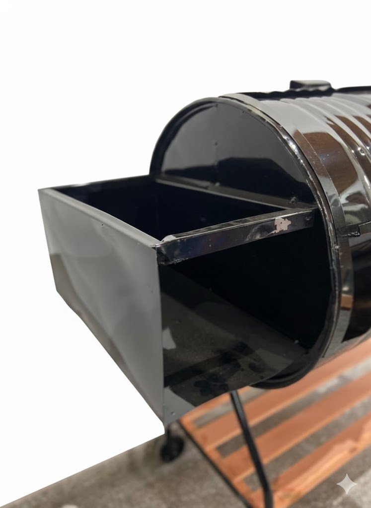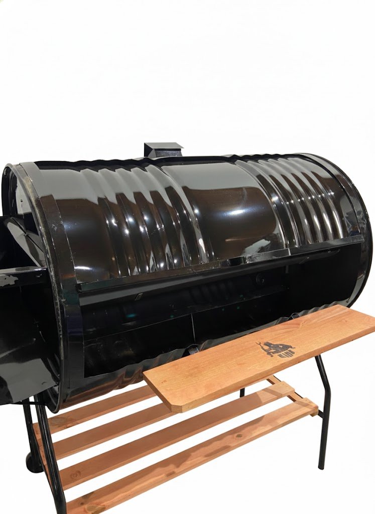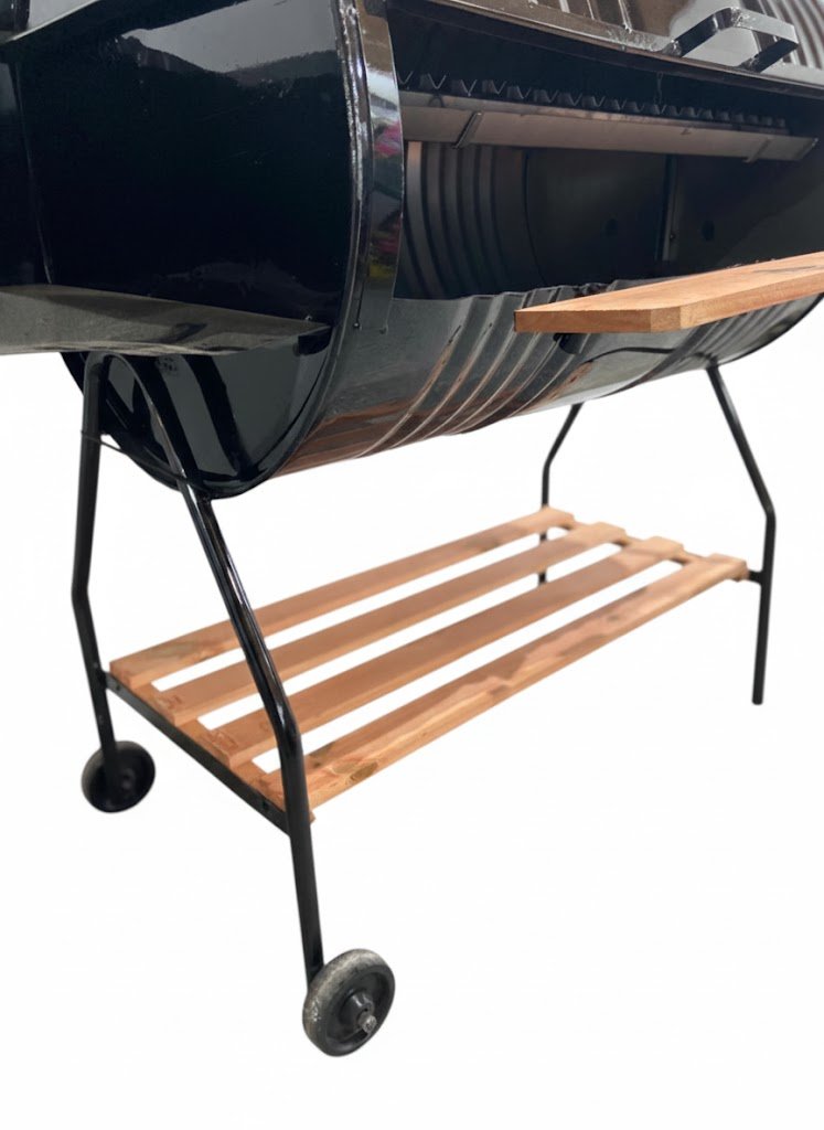 Parrilla tipo barril fabricada en chapa resistente, con amplia superficie de cocción, cámara lateral auxiliar, estantes de madera funcionales y ruedas para fácil traslado. Ideal para asados al aire libre, combinando durabilidad, eficiencia y comodidad.