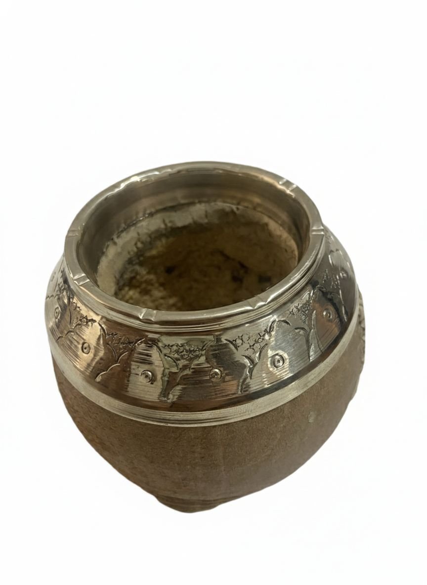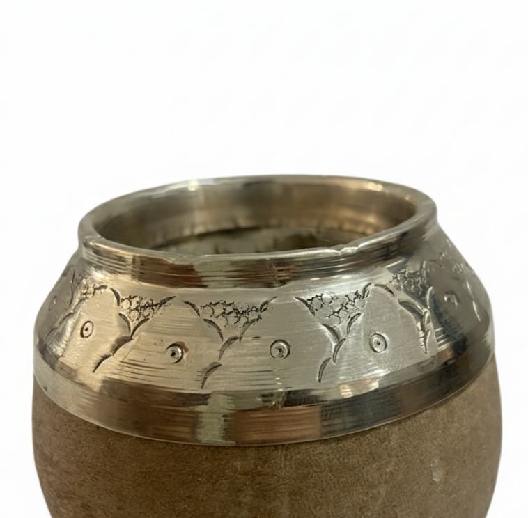 La virola de alpaca, finamente trabajada con detalles grabados, refuerza la boca del mate, aporta durabilidad y suma un toque distintivo de calidad. Además de su función estética, la virola protege la calabaza y prolonga la vida útil del producto.
