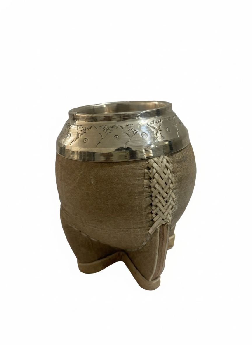 El exterior presenta un revestimiento trabajado en cuero, con costura y trenzado decorativo que aportan un acabado artesanal, elegante y resistente. El diseño característico del mate tipo torpedo, brinda un agarre cómodo y firme, ideal para el uso diario.