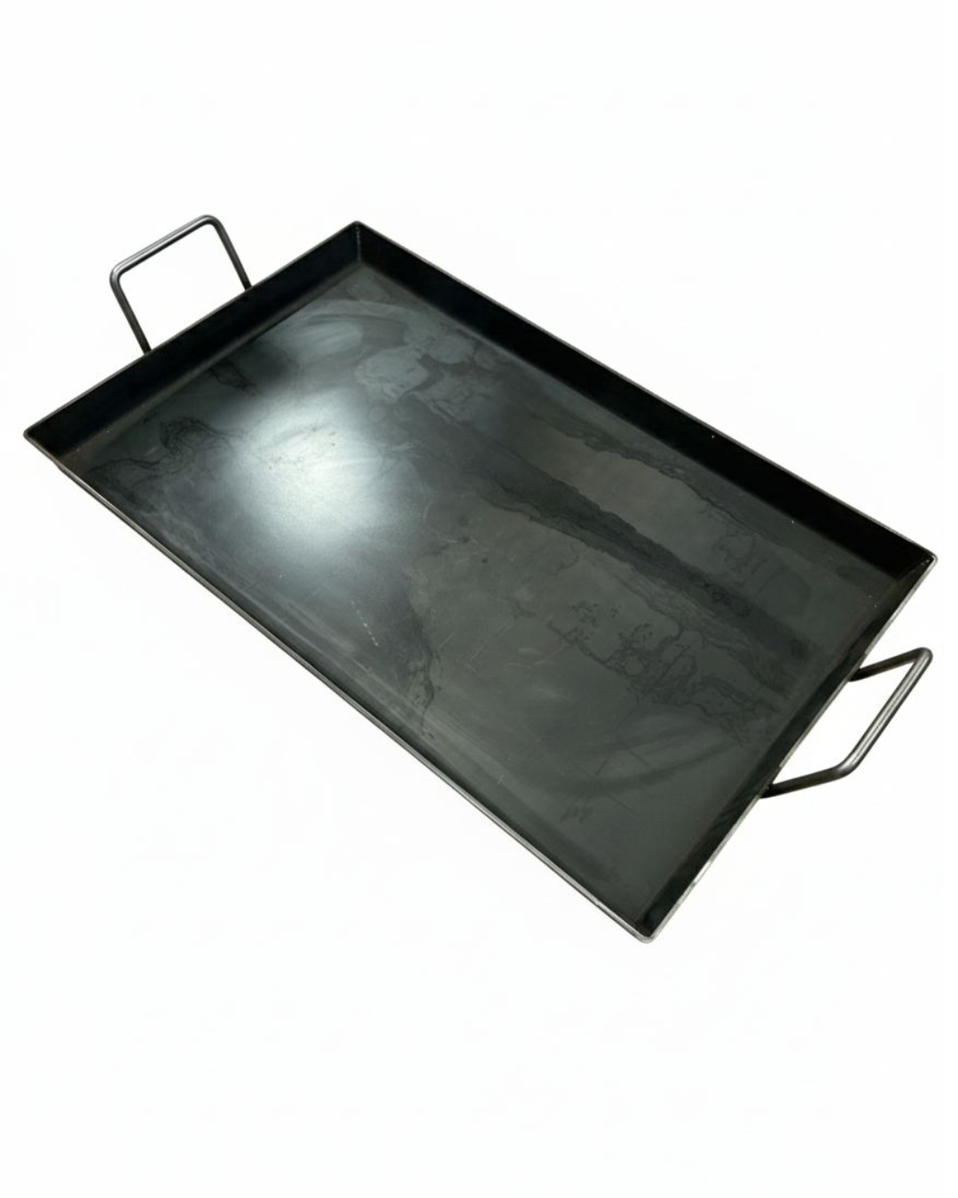 Plancheta de hierro de 60 x 37 cm con manijas metálicas. Ideal para hamburguesas y cocciones en cantidad. Amplia, resistente y de excelente distribución del calor.