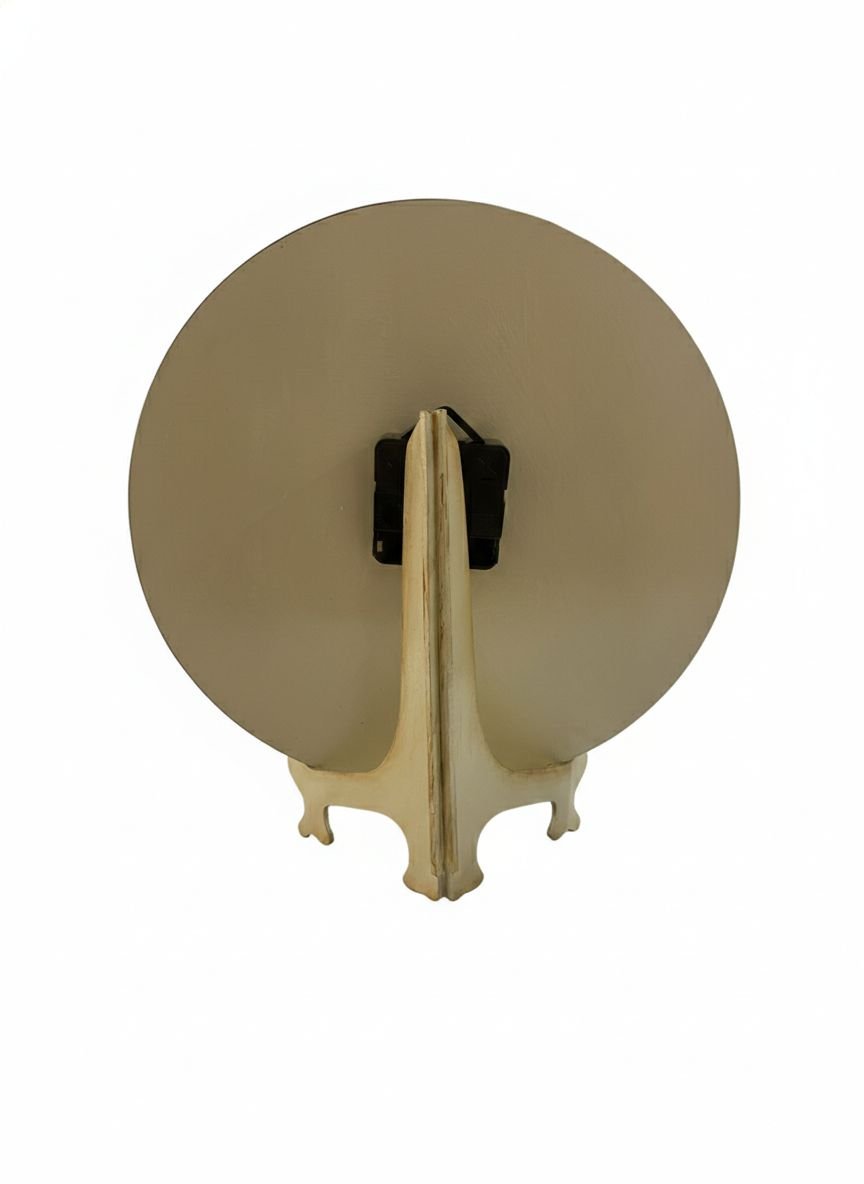 Reloj artesanal de pared de 30 cm con diseño. Incluye base adicional para usar colgado o apoyado. Una pieza funcional y decorativa, ideal para sumar estilo y calidez a cualquier ambiente.