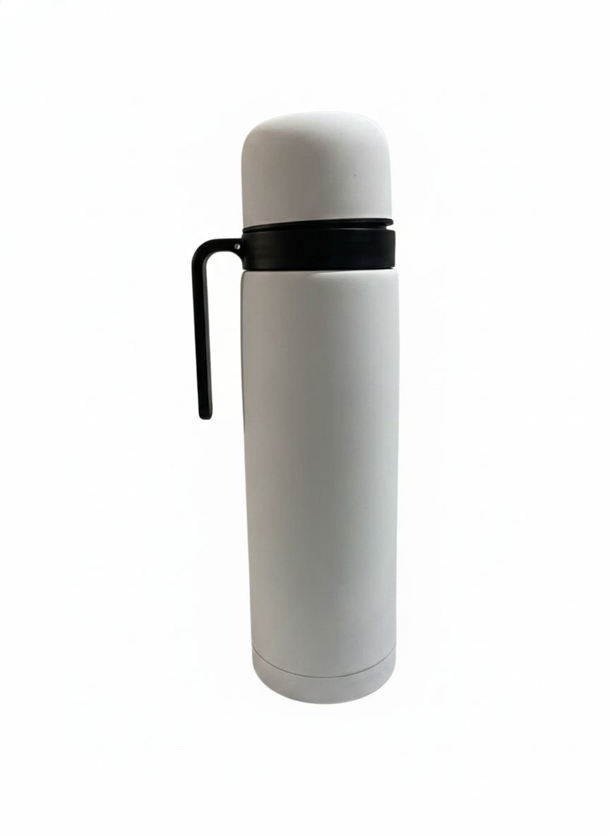 Termo de acero inoxidable blanco, con tapa pico vertedor y manija lateral. Resistente, práctico y de diseño moderno, ideal para mantener la temperatura del agua y disfrutar del mate todos los días.