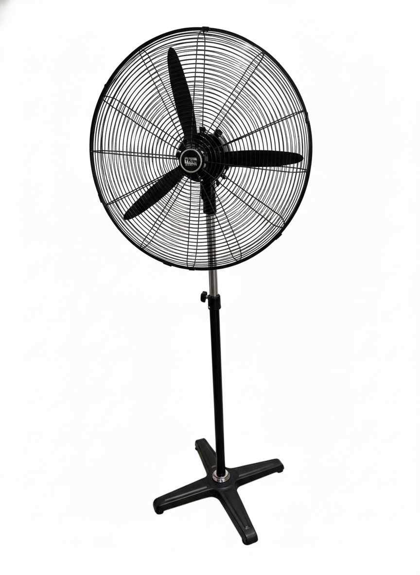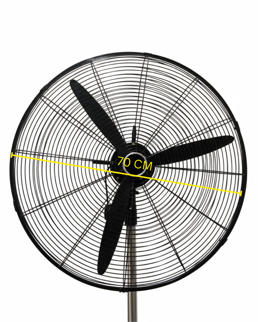 Ventilador industrial de pedestal diseñado para ofrecer un alto rendimiento y durabilidad. Cuenta con una estructura metálica robusta, aspas de gran tamaño y una rejilla de seguridad que garantizan un flujo de aire potente y constante. Incorpora tres velocidades que permiten regular la intensidad de la ventilación según las necesidades del ambiente. Su base estable proporciona firmeza durante el uso, mientras que su altura ajustable facilita dirigir el aire de forma precisa. Ideal para talleres, bodegas, fábricas, gimnasios o espacios comerciales donde se requiere una ventilación eficiente y confiable.