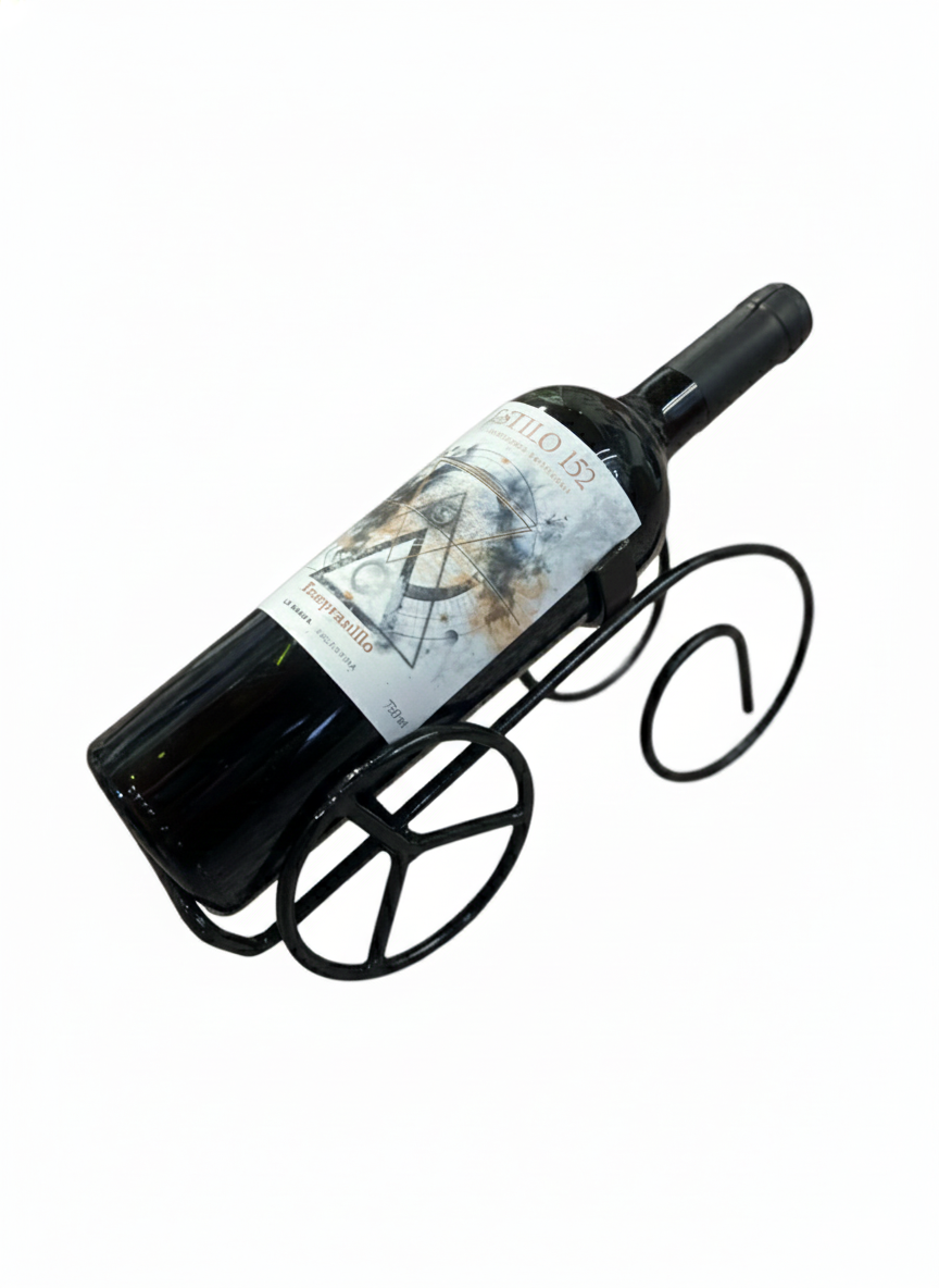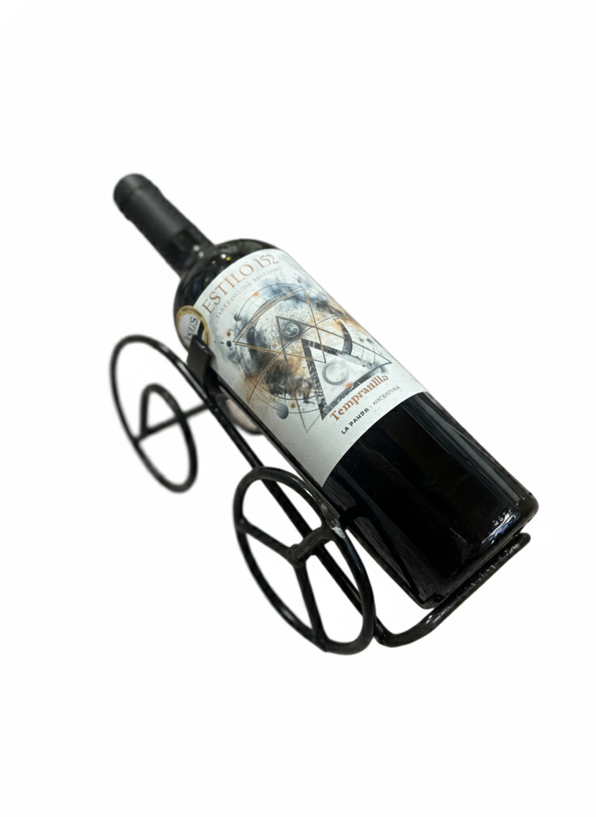 Base de acero resistente color negro con porta vino y vino incluido. Presenta un vino pampeano Estilo 152, elaboración artesanal, Tempranillo. Diseño elegante y robusto, ideal para regalo o para realzar cualquier espacio.